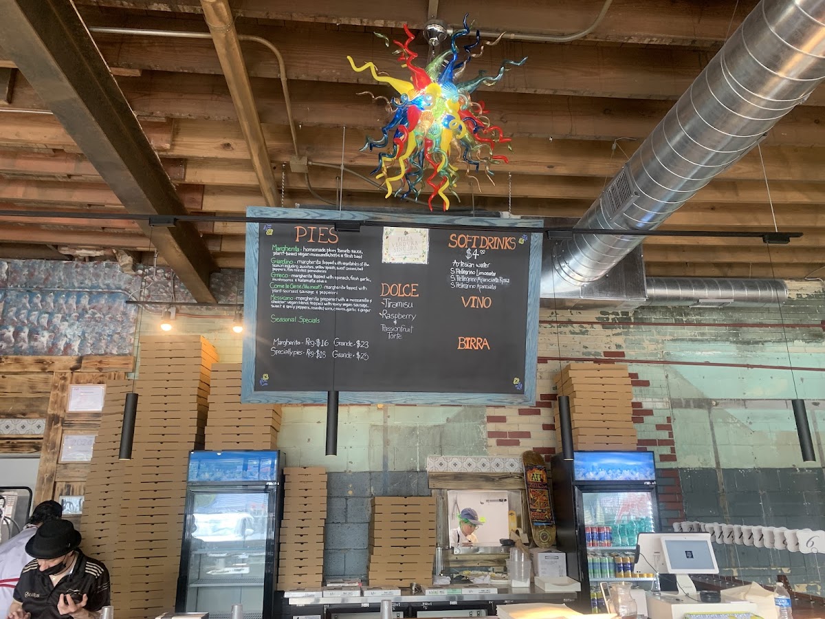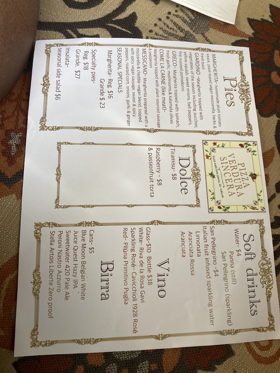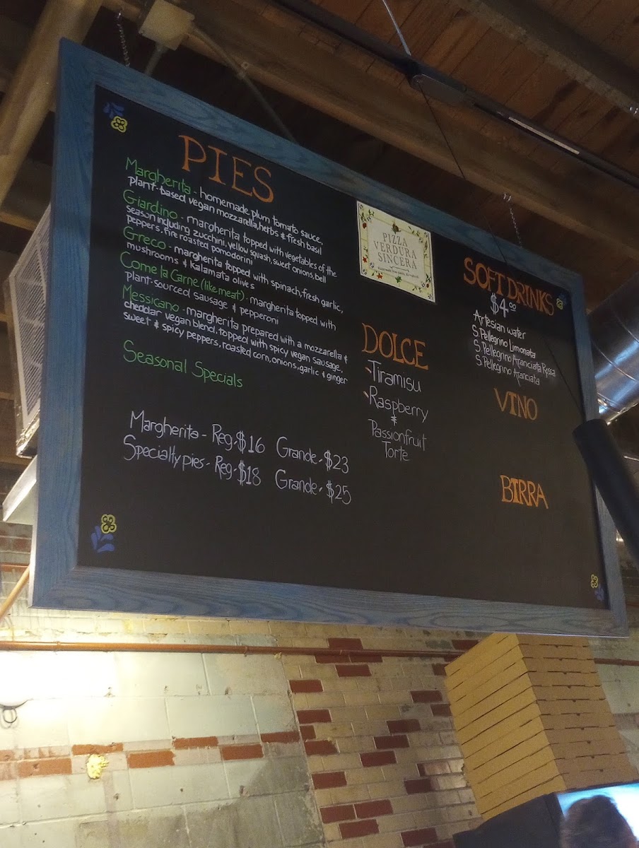 Margherita topped with vegetables of the season including zucchini, yellow squash, sweet onions, bell peppers, and fire-roasted pomodorini.
